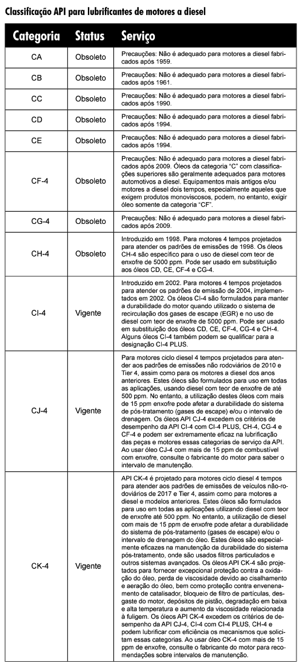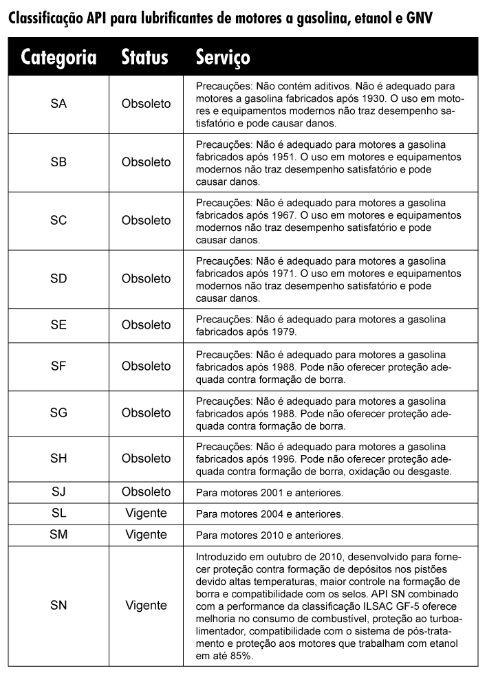 Já a sigla API significa “American Petroleum Institute” (Instituto Americano de Petróleo), e especifica qual é o desempenho que um óleo precisa ter para atender determinadas classificações de serviços.